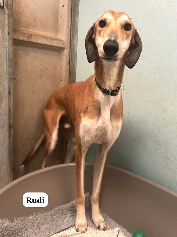 Rudi is a handsome brown and white Saluki Lurcher boy who is around 4 years old and measures approximately 26 inches TTS. Rudi has only recently arrived in rescue and is still adjusting to his new surroundings. He is currently a bit nervous and is taking things slowly while he learns that he is safe. Rudi has been castrated and has received his first vaccinations. For now he is spending time settling in and building his confidence, and we will share more about him as his personality begins to shine through.